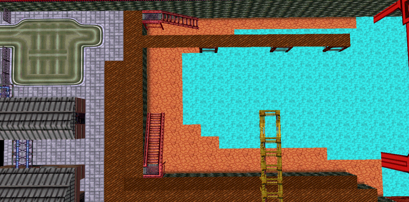 My original conception of this map was based off of the fun with scripting I was doing in the San Andreas map in GTA2. Primarily creating boss characters with no reload times to have what looks like laser weapons. My idea was to create a map where one player can only use a Dual Pistol, Machine Gun, Shotgun, & Electro Baton, with no reload times, & close to 2000 thousand health, but is forced to only be able to walk, while all the other players can move around normally. I was gonna call it "Juggernaut." All high tier weapons (Rocket Launcher, Flamethrower, Electro Gun, Molotovs, etc) were going to be high up in the air, requiring platforming that a character moving at a walking speed could not perform (to prevent the Juggernaut from being able to spam missiles) but all health, armor, fast reload, double damage, etc, are going to be on ground level, making getting them riskier due to the Juggernaut being on ground level. There'll also be a lot of hiding spots.