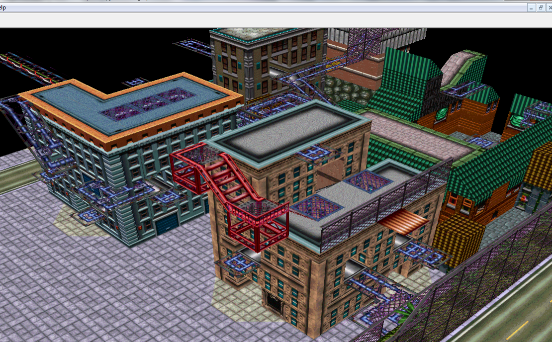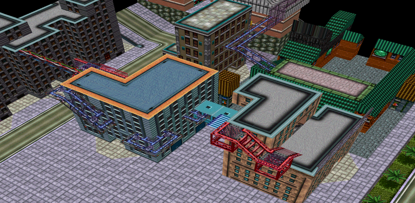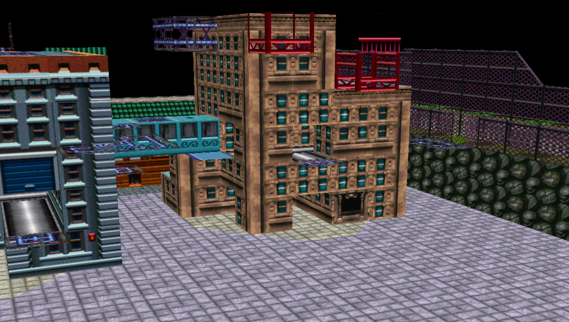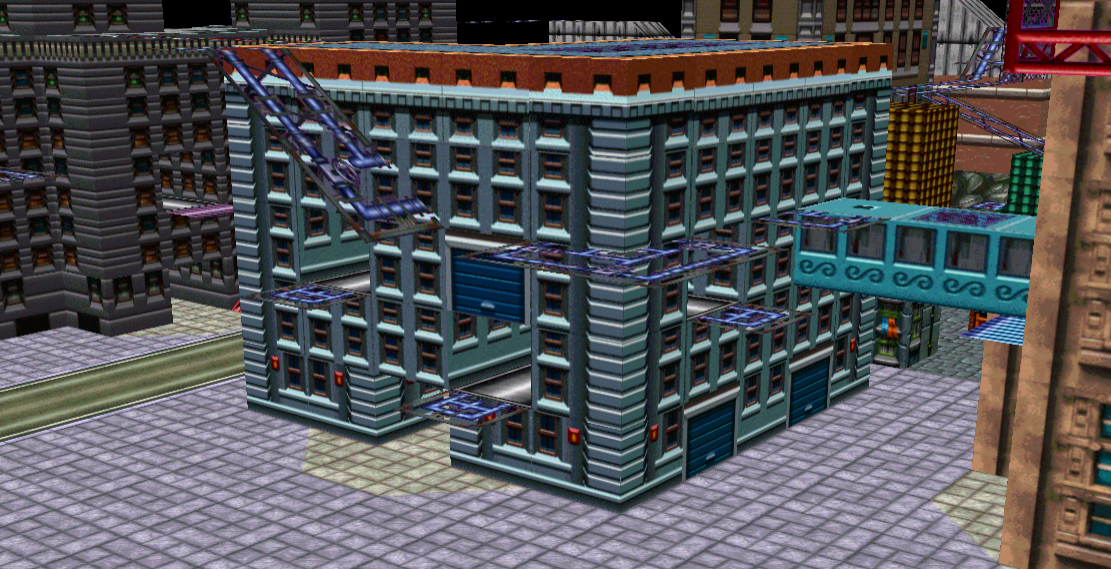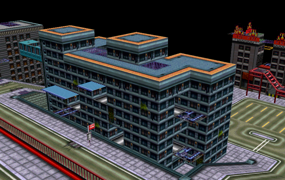 The very last building is the "Fire House" which is going to be a multitiered mini-arena that you have to drop down into (you can't enter it from street level). It'll have flamethrowers in all ground level entrances, molotovs on the yellow platforms (only accessible by dropping down from the roof), & three rocket launchers on the roof. The "Fire" signs make it so that rocket misfires can still blow the player down inside the building with its shockwave.
