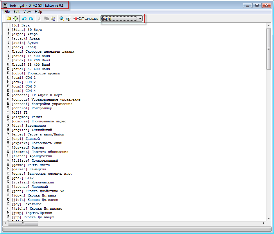 2. Add a translation bob_r.gxt for GTA Manager - this my translation. In GTA Manager works great. But GXT Editor (in tool bar) shows Spanish.