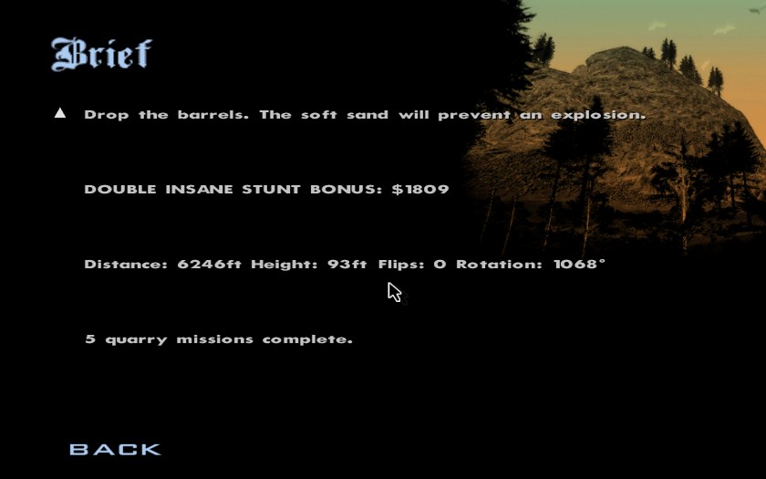 Although this was years ago I remember I was doing the quarry missions at the time (and actually says "5 quarry missions complete" too) and I still have no idea how it counted 6,246 ft as an insane stunt! :shock: