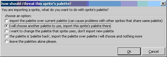 Choose option #2 "i will choose another palette to use, import this sprite's palette here" and press the OK button.