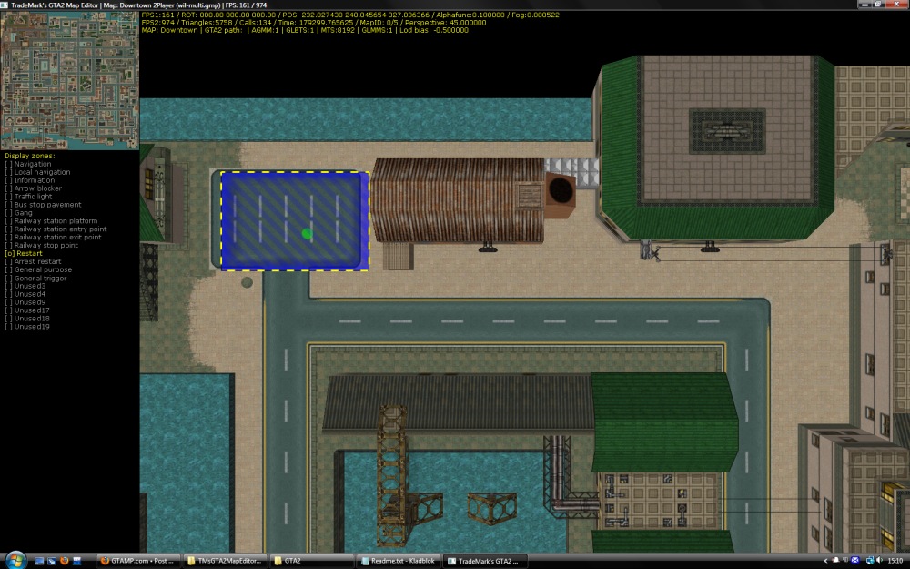 how did you find out it did not work? i heard arrest restart zones doesnt work on multiplayer (which is how the TEST function works i think, it launches it as multiplayer) try adjusting the restart zone types, and see if it works.Cuban-Pete wrote:- I removed all arrest restart points, made a new one somewhere else, entered SAVEZONES, got message it was saved, started GTA2, but it did not work...